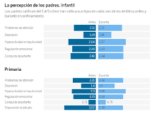 Además, perciben que la mayoría de los niños han empeorado su estado psicológico tanto en infantil (55%) como en primaria (64%). No obstante, este resultado es mayor en el ciclo de primaria, donde el 36% de las familias creen que sus hijos han mejorado o se han mantenido igual (17% igual y un 19% han mejorado). En infantil es mayor el porcentaje de niños que no experimentan cambios (28%) y similar el de los niños que mejoran su estado psicológico (19%). Aunque el psiquiatra Martínez Manjarrez, advierte de que estos cuestionarios deben hacernos pensar, pero no debemos olvidar que muestran la opinión de los padres, que pueden estar proyectando sus propias emociones.